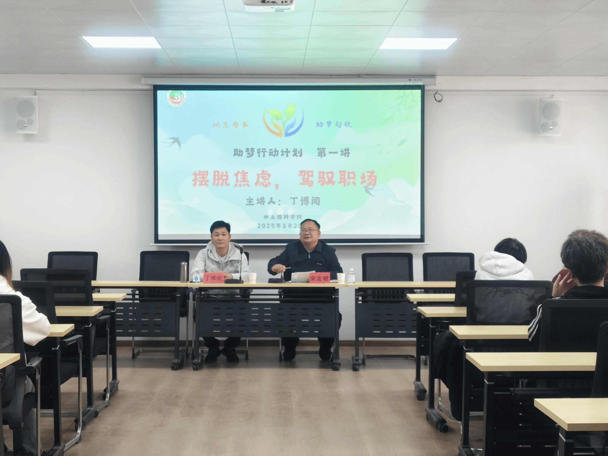 3月20日下午,bwin必赢在线登入在逸夫水利楼B210开展“助梦行动计划” 第一讲,邀请江西大通技术咨询有限公司总经理丁博闻做“摆脱焦虑,驾驭职场”的经验分享。学院分管就业工作的领导、辅导员及60余名学生聆听了讲座。