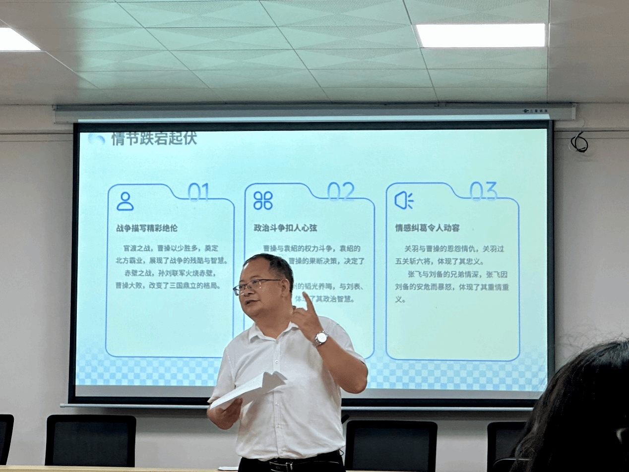 学院党委副书记宋友根做了题为“品三国、悟人生”的专题分享。他结合自己品读《三国演义》体会,从《三国演义》的文学魅力、《三国演义》的历史价值、《三国演义》的现实意义三个方面进行了领学。他深入剖析经典人物形象,从刘备的坚韧不拔到曹操的宽厚爱才,再到关羽的忠义勇敢、诸葛亮的足智多谋等,生动阐释历史人物身上蕴含的精神品质。他还总结了官渡之战、赤壁之战、夷陵之战三大战役及里面蕴含的智慧和谋略。他对全体团学干部提出了四点希望:一是要多读书,提升品德修养;二是要善实践,锻炼智慧才能;三是要肯吃苦,磨练意志品质;四是要组团队,学会团队协作。他强调,全体团学干部要从《三国演义》等名著里面汲取智慧和力量,学会做人做事,感悟人生的道理,不断提高自己的综合素质,助力自身成长成才。